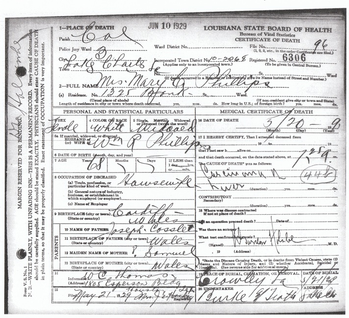 Mary Cosslett Phillips Death Certificate