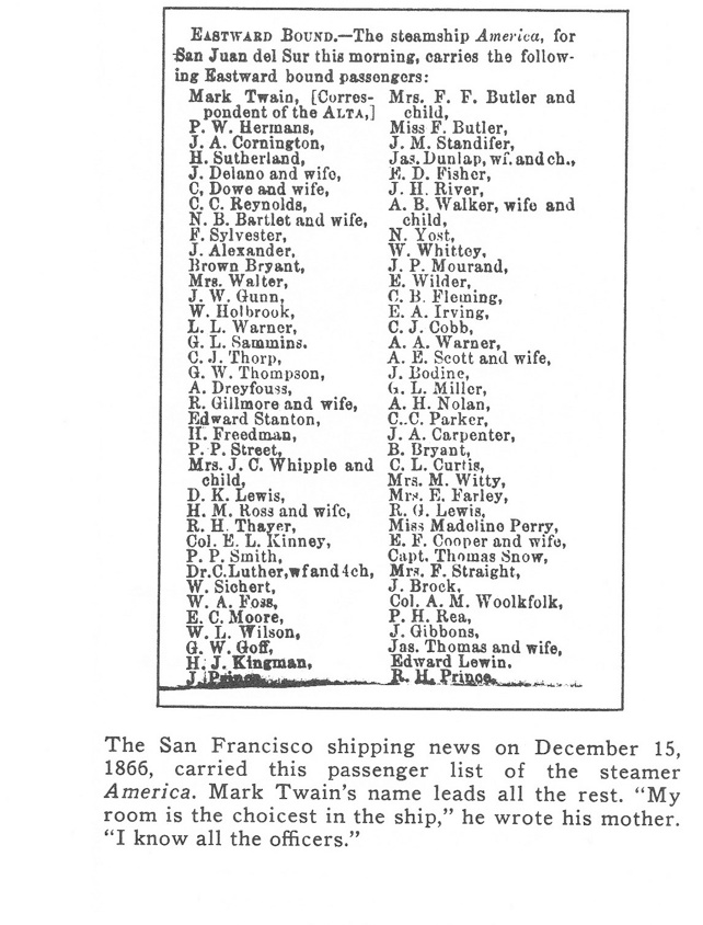 So, if he was in California in 1860 and he was back in Louisiana in 1870, it is possible that he was on the steamship ‘America’ as it sailed from the west coast to the east coast of the United States with Mark Twain among its passengers. P. P. Street is listed on the left 23 names down.